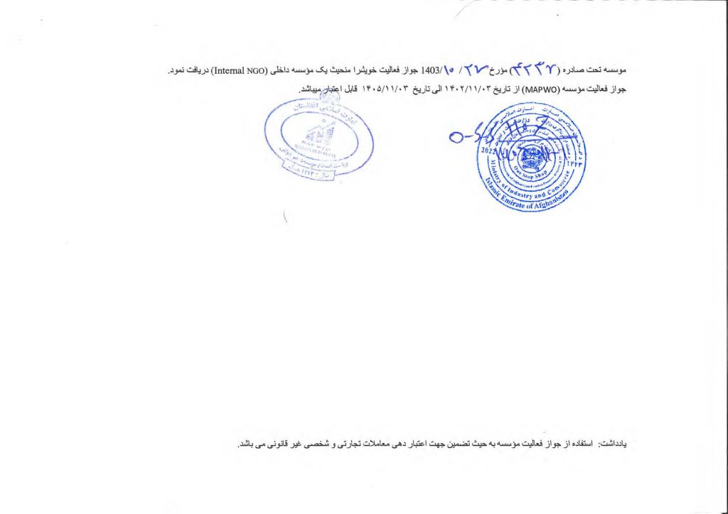 To ensure trust and accountability, displayed below is MAPWO NGO license and related approvals issued by the relevant authorities. This document confirm that our organization is formally registered and permitted to carry out its activities.